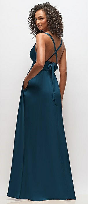 Soft Cowl Neck Ruched Side Satin Bias Maxi Dress with Shoulder Bows in atlantic blue