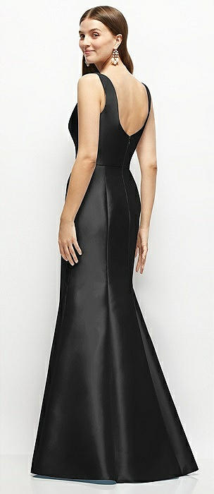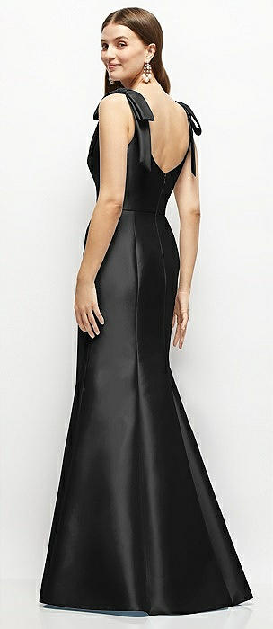 Deep V-back Satin Trumpet Dress with Cascading Bow at One Shoulder in black