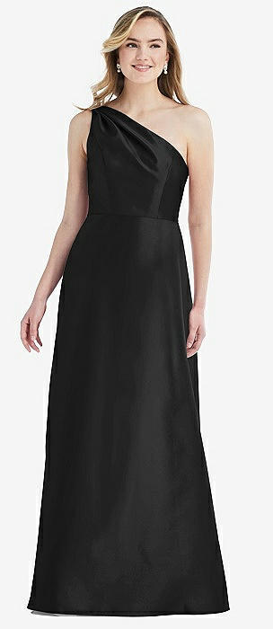 Draped One-Shoulder Satin Trumpet Gown with Front Slit in black