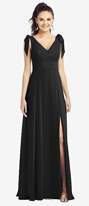 Bow-Shoulder V-Back Chiffon Gown with Front Slit in black
