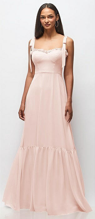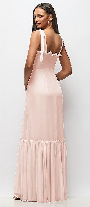 Tie-Shoulder Bustier Bodice Ruffle-Hem Maxi Dress in blush