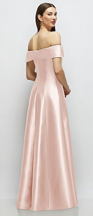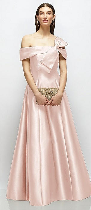 Asymmetrical Bow Off-Shoulder Satin Gown with Ballroom Skirt in blush