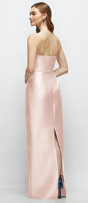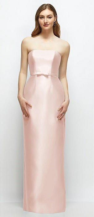 Strapless Satin Column Dress with Bow-Trimmed Skinny Belt in blush