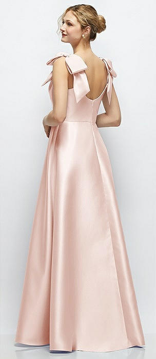 Basque-Neck Satin Column Maxi Dress with Off-the-Shoulder Bows in blush