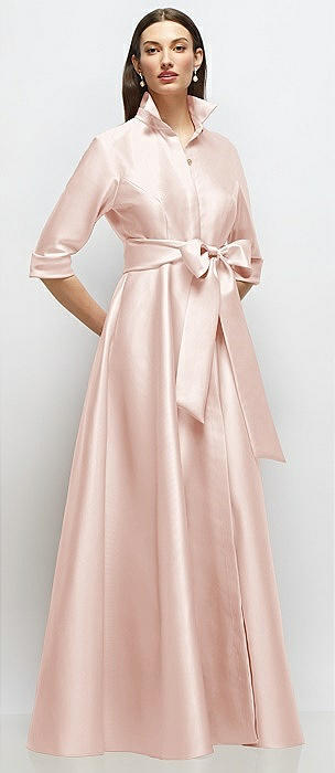 3/4 Sleeve Satin Shirt Dress Gown with Sash and Jeweled Buttons in blush