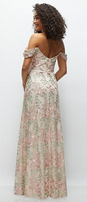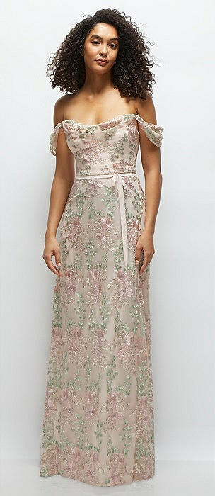 Off-the-Shoulder A-line Floral Embroidered Dress with Skinny Tie Sash in blush
