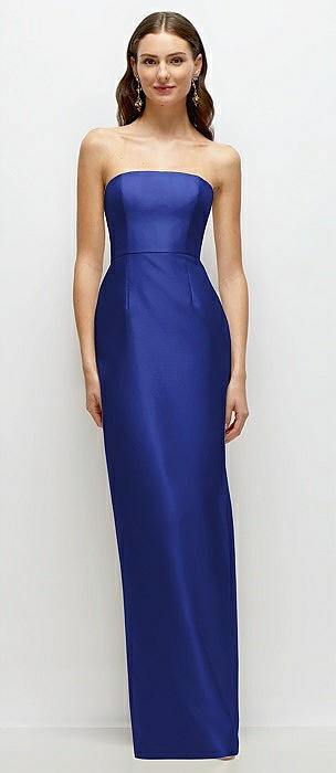 Strapless Satin Column Dress with Back Slit in cobalt blue