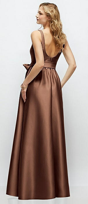 Basque-Neck Satin Column Maxi Dress with Off-the-Shoulder Bows in cognac