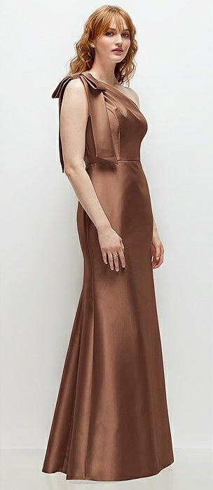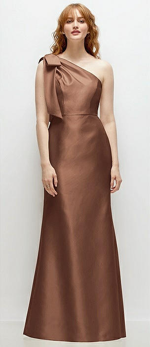 Bow One-Shoulder Satin Trumpet Gown in cognac