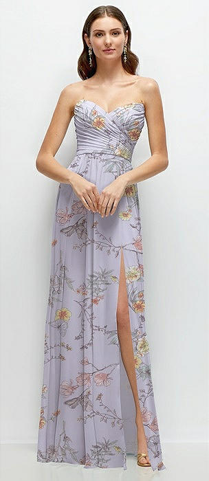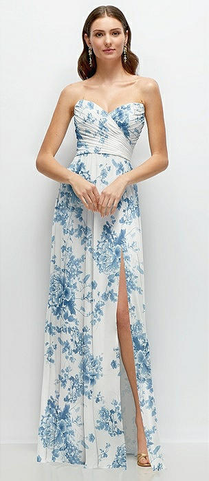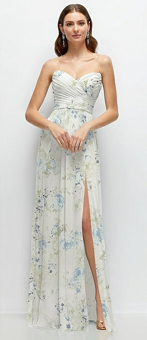 Strapless Pleated Surplice Chiffon Maxi Dress with A-Line Skirt in coquette floral print