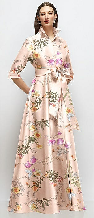 3/4 Sleeve Floral Satin Shirt Dress Gown with Sash and Jeweled Buttons in bow and blossom print