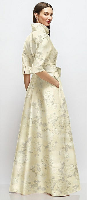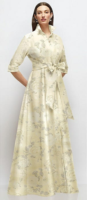 3/4 Sleeve Floral Satin Shirt Dress Gown with Sash and Jeweled Buttons in butter yellow floral