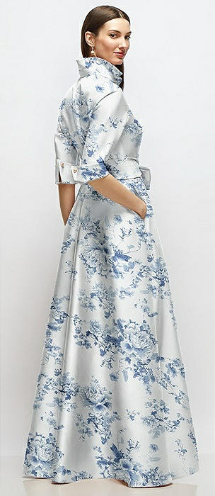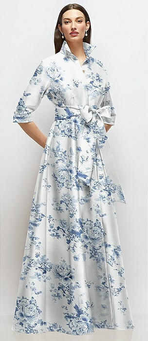 3/4 Sleeve Floral Satin Shirt Dress Gown with Sash and Jeweled Buttons in porcelain blue seraphina floral