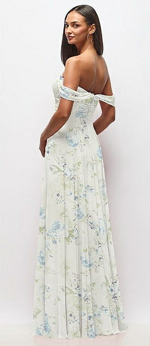 Off-the-Shoulder Draped Chiffon Maxi Dress in coquette floral print