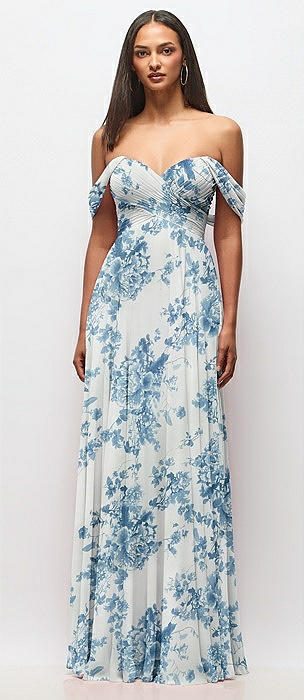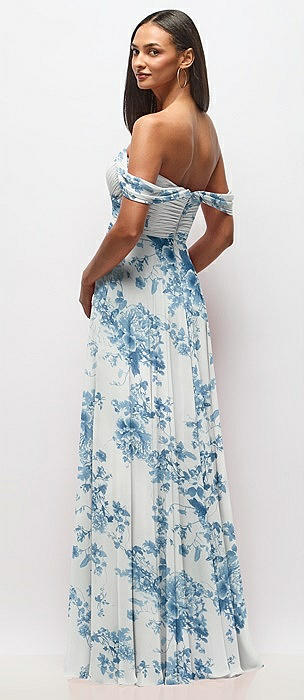 Off-the-Shoulder Draped Chiffon Maxi Dress in watercolor print