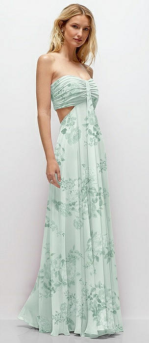 Strapless Empire Waist Cutout Maxi Dress with Covered Button Detail in mint green floral