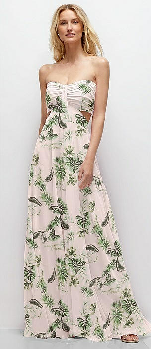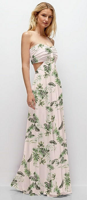 Strapless Empire Waist Cutout Maxi Dress with Covered Button Detail in palm beach print