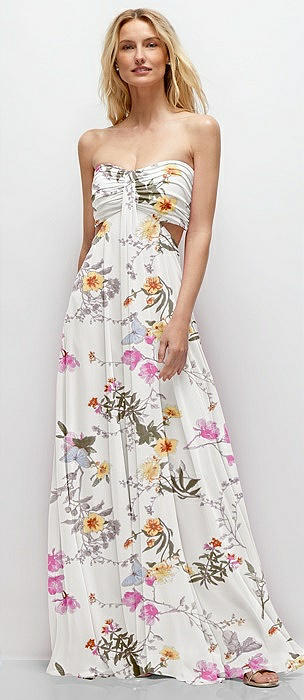 Strapless Empire Waist Cutout Maxi Dress with Covered Button Detail in coquette floral print