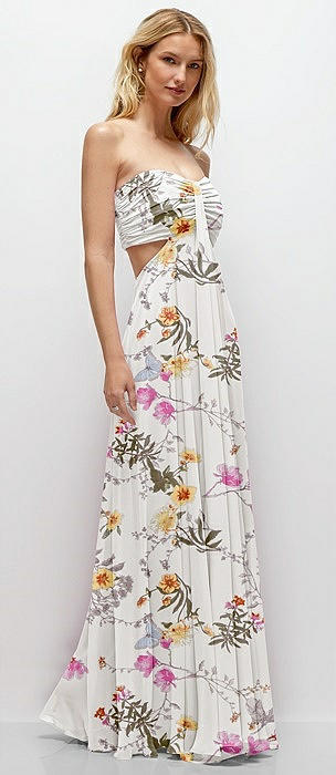 Strapless Empire Waist Cutout Maxi Dress with Covered Button Detail in butterfly botanica ivory