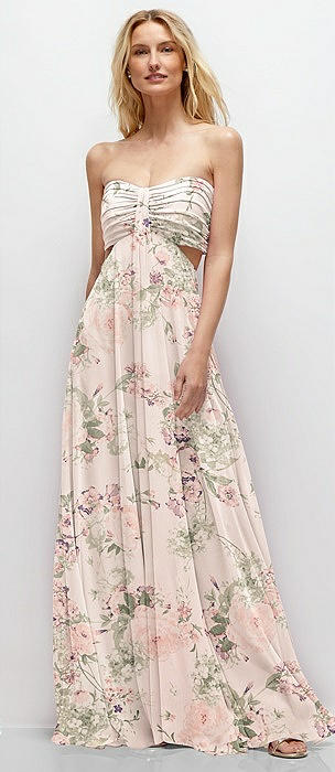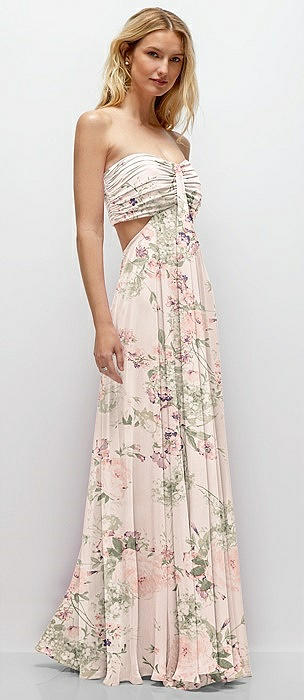 Strapless Empire Waist Cutout Maxi Dress with Covered Button Detail in blush garden