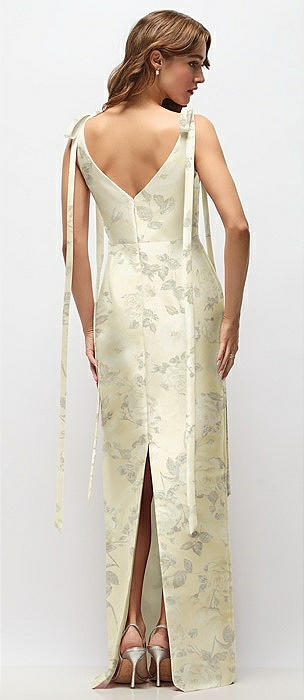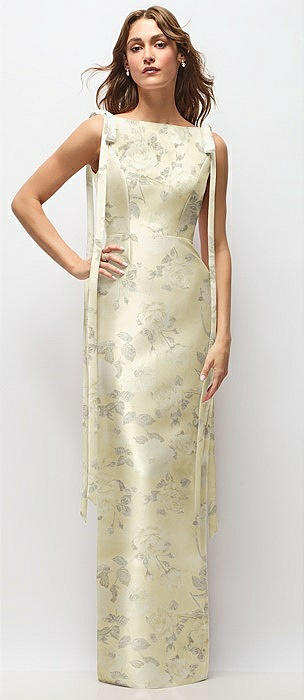 Floral Bateau Neck Satin Column Maxi Dress with Exaggerated Tail Bow Straps in butter yellow floral