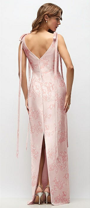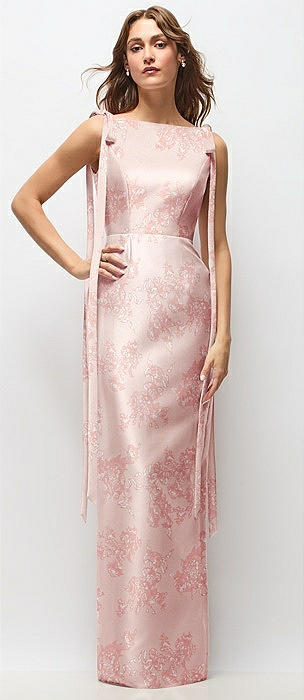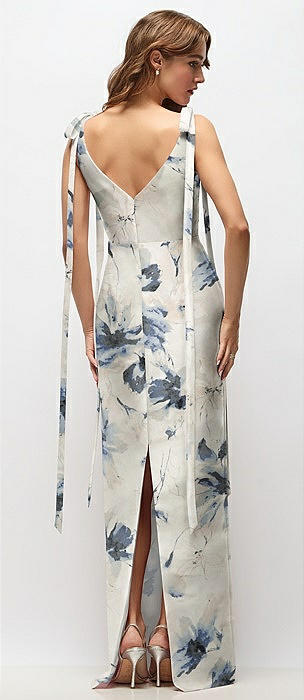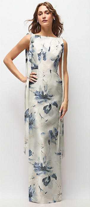 Floral Bateau Neck Satin Column Maxi Dress with Exaggerated Tail Bow Straps in bow and blossom print