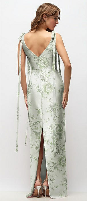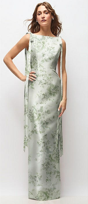 Floral Bateau Neck Satin Column Maxi Dress with Exaggerated Tail Bow Straps in sage cottage rose