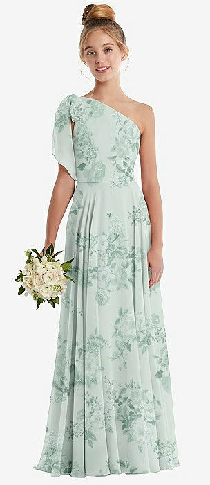 One-Shoulder Scarf Bow Chiffon Junior Bridesmaid Dress in mint green floral