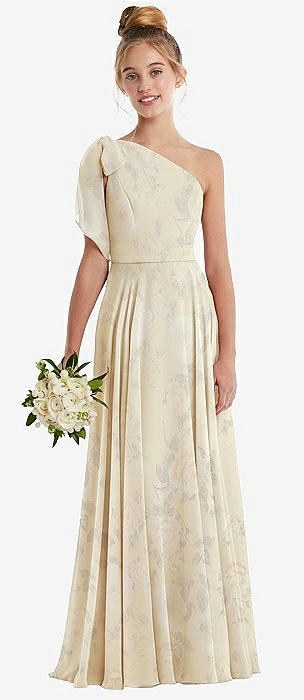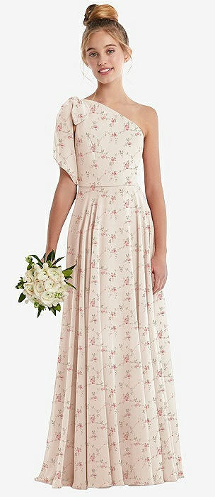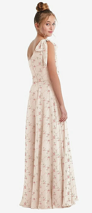 One-Shoulder Scarf Bow Chiffon Junior Bridesmaid Dress in coquette floral print