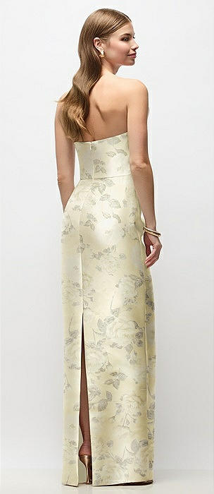 Strapless Cuff Floral Satin Midi Dress with Column Skirt & Back Bow in butter yellow floral