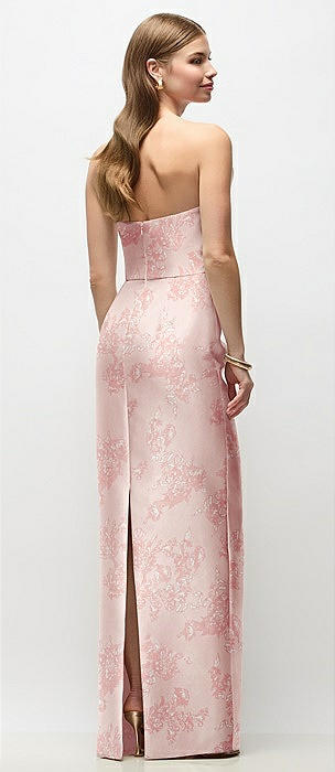 Strapless Cuff Floral Satin Midi Dress with Column Skirt & Back Bow in butterfly botanica pink sand