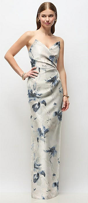 Strapless Asymmetrical Draped Satin Column Floral Maxi Dress in inkwash blue floral