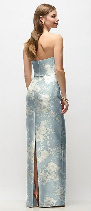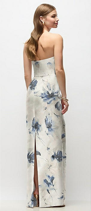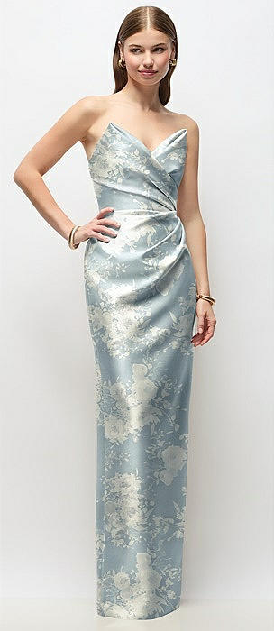 Strapless Asymmetrical Draped Satin Column Floral Maxi Dress in bow and blossom print