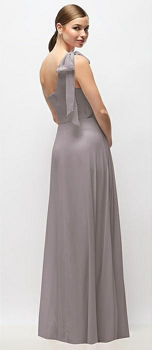 Bow-Shoulder V-Back Chiffon Gown with Front Slit in cashmere gray