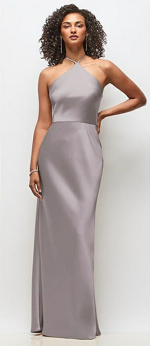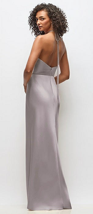 High-Neck Halter Stretch Satin Maxi Dress with Bias A-line Skirt in cashmere gray