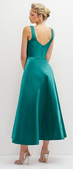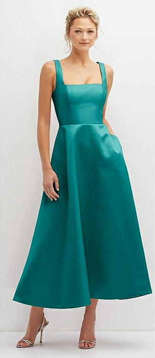 Square Neck Satin Midi Dress with Full Skirt & Pockets in jade