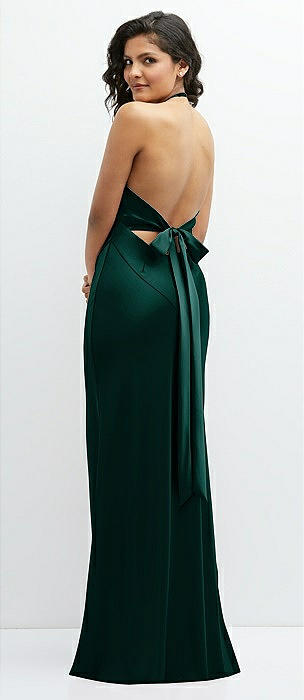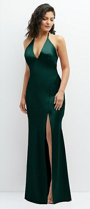 Plunge Halter Open-Back Maxi Bias Dress with Low Tie Back in evergreen