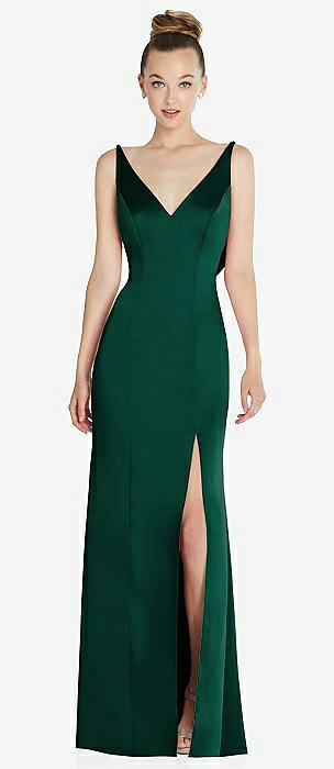 Jewel Neck Bowed Open-Back Trumpet Dress with Front Slit in hunter green