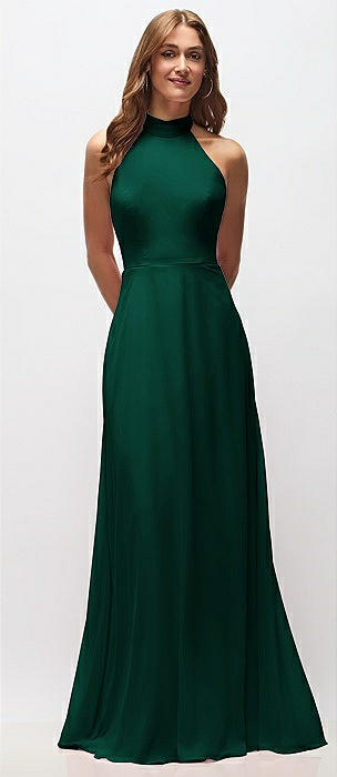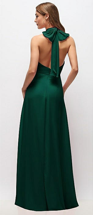 Shirred Skirt Jewel Neck Halter Dress with Front Slit in hunter green
