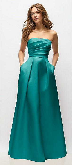 Strapless Hand-Pleated Bodice Satin Maxi Dress with Full Pleated Skirt in jade
