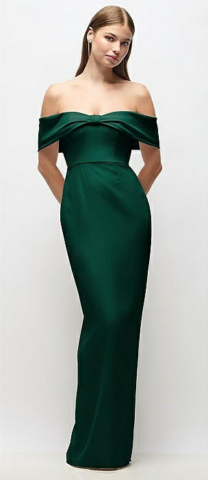 Off-the-Shoulder Crepe Column Maxi Dress with Bow-Pinch Detail in hunter green