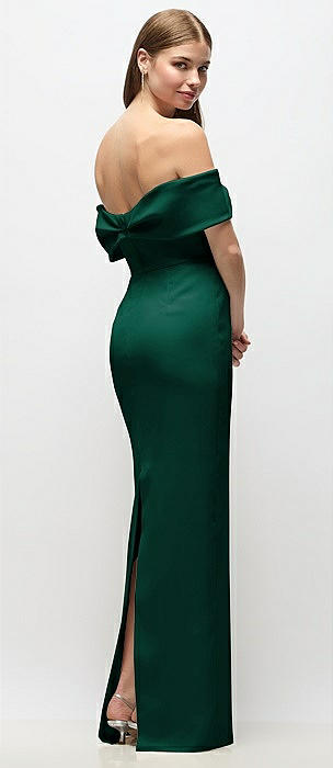 Basque-Neck Satin Column Maxi Dress with Off-the-Shoulder Bows in hunter green
