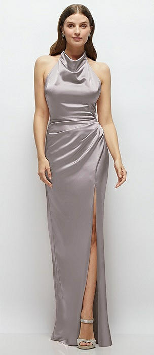 Cowl Halter Open-Back Satin Maxi Dress in cashmere gray
