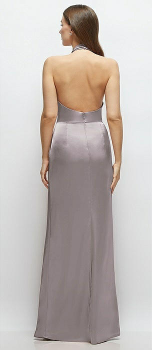 High Halter Tie-Strap Open-Back Satin Maxi Dress in cashmere gray