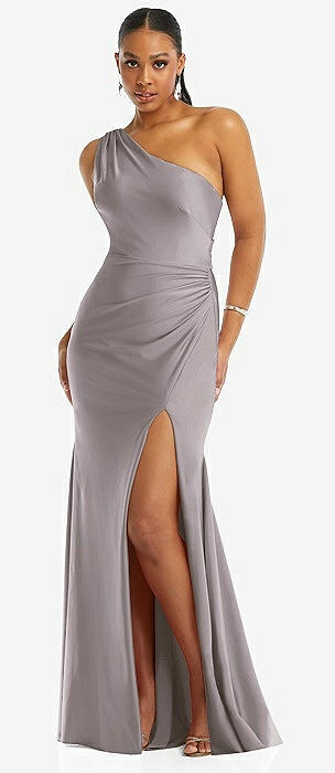 One-Shoulder Bias-Cuff Stretch Satin Mermaid Dress with Slight Train in cashmere gray