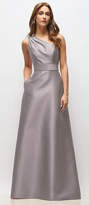 Draped One-Shoulder Satin Maxi Dress with Pockets in cashmere gray