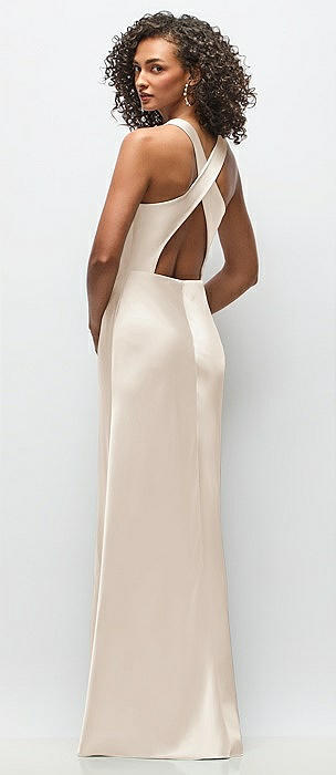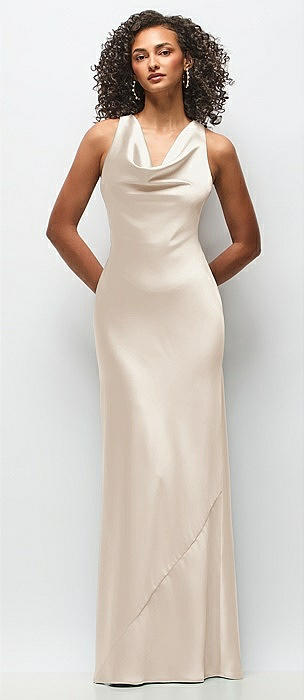 Cowl Neck Criss-Cross Back Satin Maxi Dress in oat