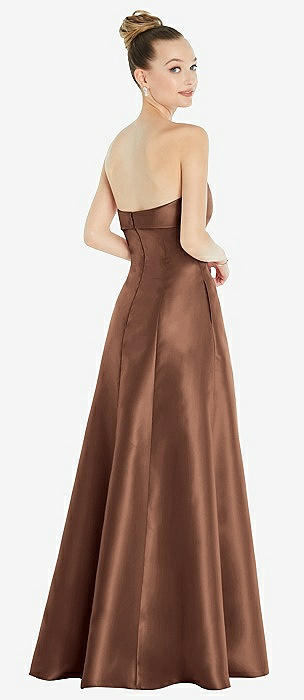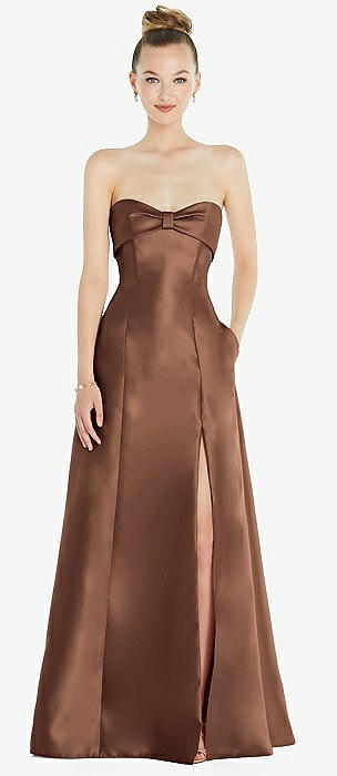 Bow Cuff Strapless Satin Ball Gown with Pockets in cognac