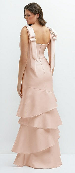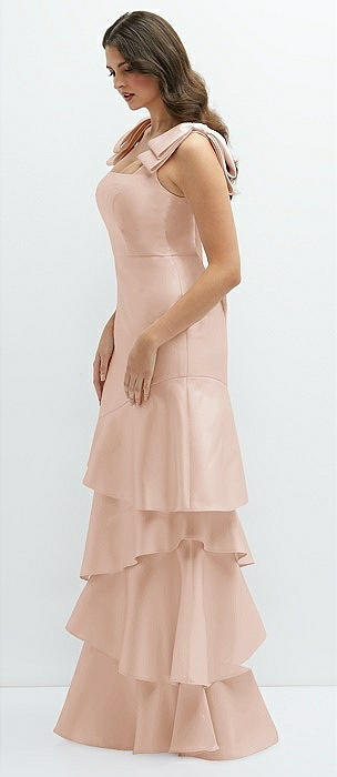Bow-Shoulder Satin Maxi Dress with Asymmetrical Tiered Skirt in cameo