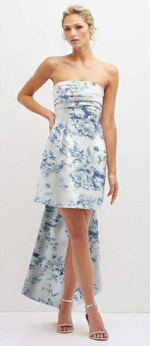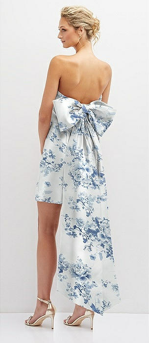 Floral Strapless Satin Column Mini Dress with Oversized Bow in cottage rose larkspur